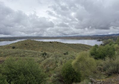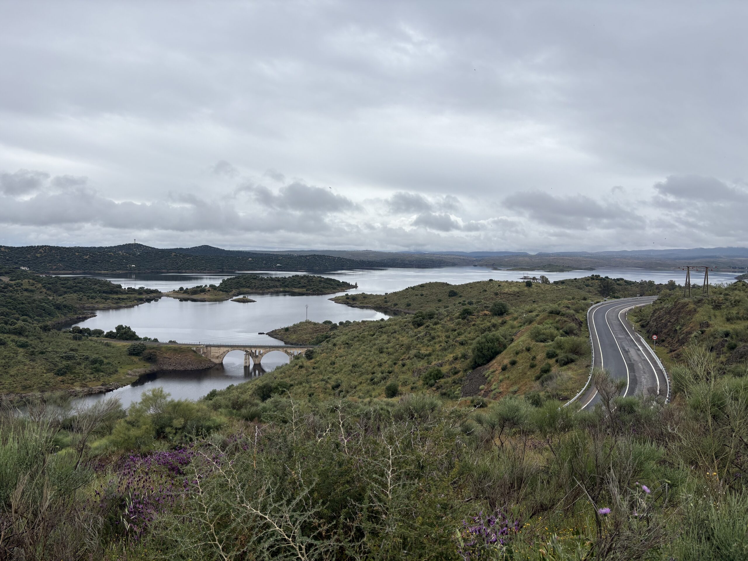 The view from up was spectacular over the reservoirs created along the Tajo River. The trail descended to a road shortly before the bridge over the river. The Tajo is the longest river in the Iberian Peninsula, approximately 1,007 km long; it originates in the mountains of eastern Spain in the Sierra de Albarracín and flows west across Spain, then forms part of the border with Portugal and empties into the Atlantic Ocean at Lisbon.